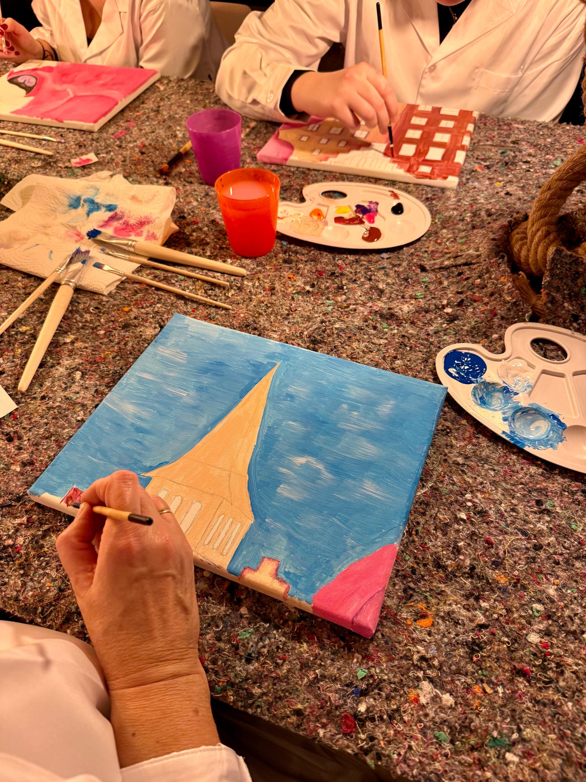 inklusive: eine Leinwand pro Person (30 × 40 cm), Farben sowie wahlweise Fingerfood oder Kaffee und Kuchen, dazu Apfelsaft und Wasser