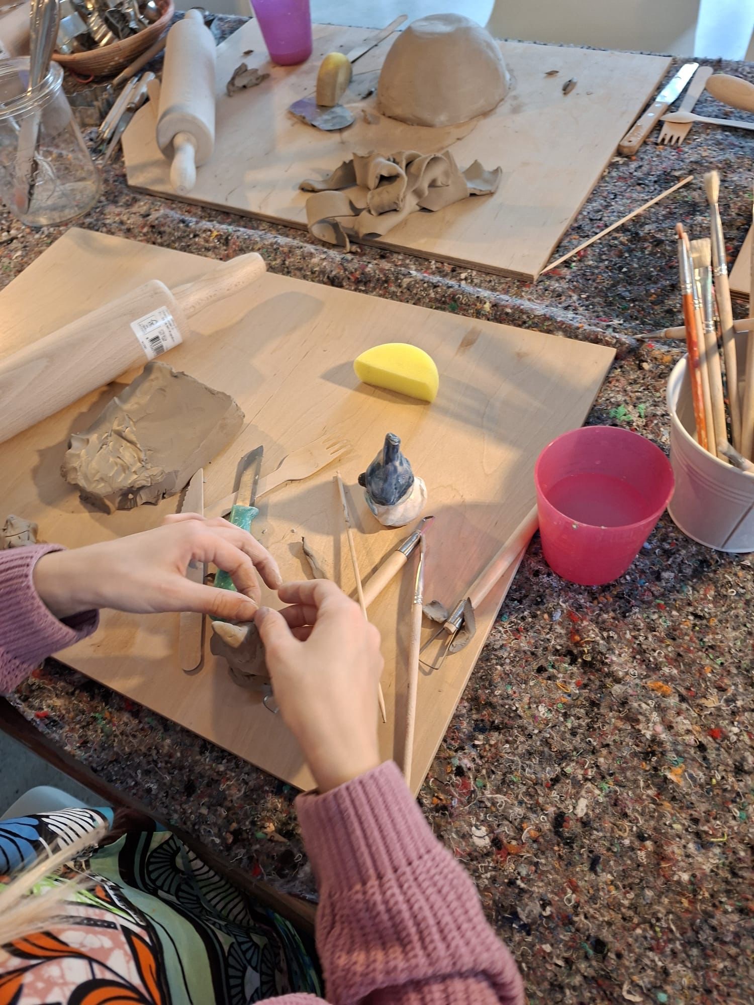 In lockerer Atmosphäre können die Kinder mit Ton und Farbe arbeiten, ihrer Fantasie freien Lauf lassen und eigene kleine Kunstwerke erschaffen.